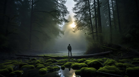 a lone person stands in a green forest under the sun, surrounded by a misty atmosphere. this uhd image captures the beauty of layered and atmospheric landscapes, reminiscent of romantic riverscapes found in new american documentary photography. it is a captivating national geographic photo that evokes an adventure-themed ambiance. ai generated