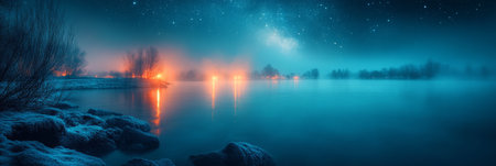 Night Winter Landscape With Milky Way, Tranquil Blue Water Under Starry Sky Reflecting Orange Light