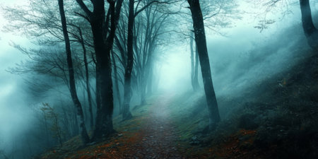 Mysterious fog envelops a lush forest creating an atmospheric escape