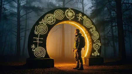 Man standing in the middle of a magical forest with a glowing arched entrance