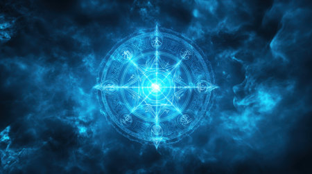 This stunning image features a magical circle glowing with blue light surrounded by a cosmic backdrop. Perfect for fantasy or technology themes.