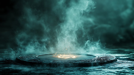 A mystical 3D background showcasing an ancient stone podium covered in glowing runes. Ethereal mist and soft ambient lighting add a magical, fantasy-inspired atmosphere.