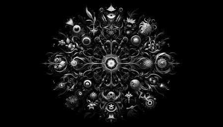 A detailed symbol set against a dark textured background, blending ancient and mystical elements. The design features geometric shapes and intricate patterns that evoke a sense of spirituality and mystery.