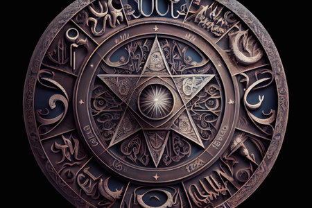 The zodiac symbol is a mystical representation of the celestial wheel, depicting the 12 astrological signs and their positions in the sky at the time of a person's birth. Realistic illustration created by Generative AI