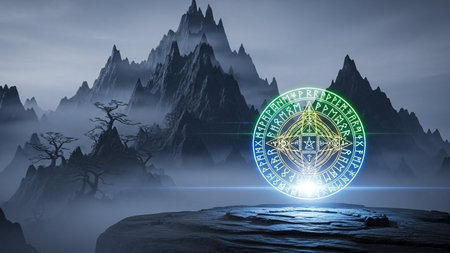 A dramatic fantasy landscape sharp, dark mountains shrouded in mist. In the foreground, a rocky outcrop supports a large, circular rune symbol. The rune is intricately designed with geometric patterns and ancient script, glowing with vibrant neon green and blue light. A bright light emanates from the center of the circle, illuminating the stone beneath it. The overall mood is mysterious, powerful, and otherworldly.