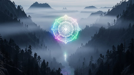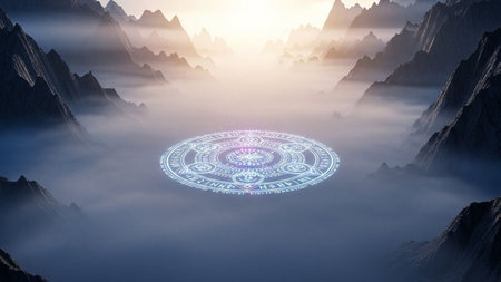 A fantasy landscape unfolds in a misty mountain valley at sunrise. At the center, a luminous, intricate magic circle glows with ethereal blue and pink light, adorned with ancient runes. The soft, warm light of dawn pierces through the fog, illuminating the peaks and creating a mystical, otherworldly atmosphere. This scene evokes a sense of ancient power, spiritual awakening, and the allure of the unknown.