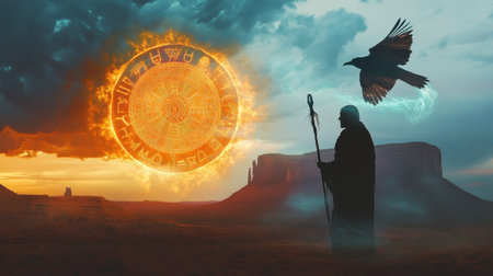 A glowing medicine wheel shines in the desert, merging with the silhouette of an elder holding a staff. Above, a thunderbird flies against a stormy sky, blending with mountain outlines.