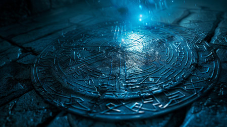 A captivating ancient symbol shines in blue light on a textured stone surface. The intricate design evokes mystery and fantasy, perfect for themes of magic and the supernatural.