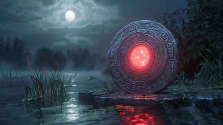 A captivating scene featuring a glowing red symbol on a stone shield standing in calm water under moonlight, surrounded by fog and grass, evoking mystery and tranquility.