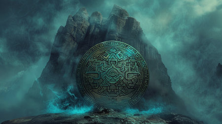 A captivating sunset landscape featuring a mysterious ancient symbol set against a dark rocky mountain, surrounded by ethereal fog and dramatic lighting.