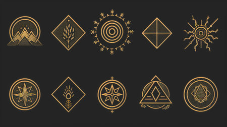 This stunning collection showcases various golden symbols and icons arranged on a textured surface, capturing the essence of spirituality and cultural heritage.