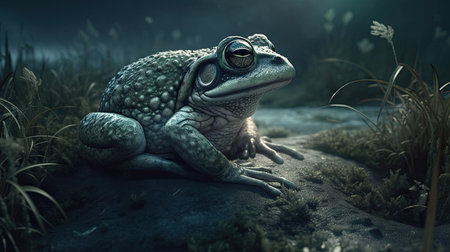 large toad sits nestled in the dewy grass, its watchful eyes reflecting the dim light of the moon.