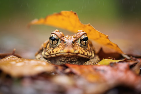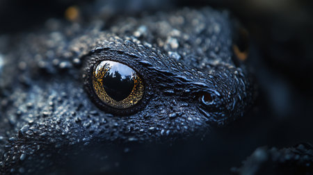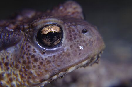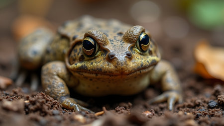Macro shot of wise toad in moist soil warty skin golden eyes earthy background