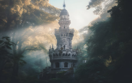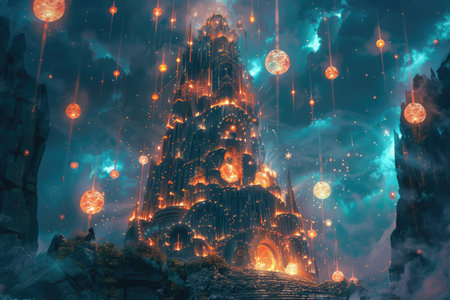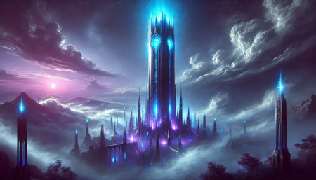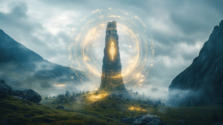 A towering structure representing a sorcerer's domain rises dramatically from a misty valley. Magical runes swirl around it, creating an enchanting atmosphere in twilight.