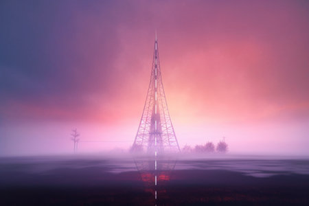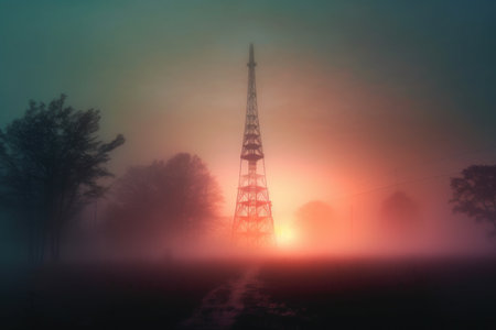5g tower standing tall in a foggy morning scene, created with generative ai