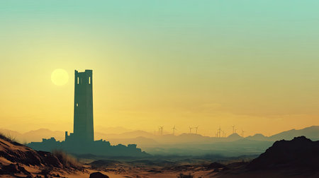 A tranquil desert landscape featuring a silhouetted tower against a stunning sunset. Windmills add subtle detail in the background, creating a serene atmosphere.