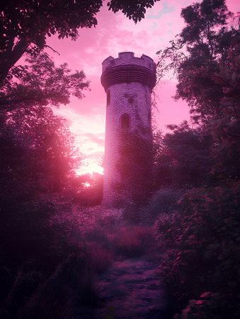 A tall stone tower stands amidst lush foliage under a vibrant pink and purple sky