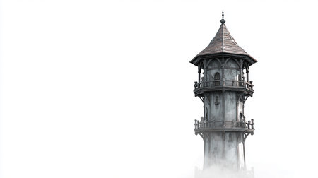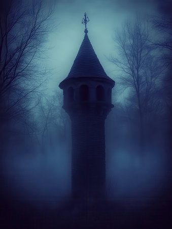 A mysterious stone tower pierces the dense fog of an atmospheric landscape, evoking a sense of abandonment. This eerie image of ancient ruins in a moody environment captures the essence of solitude and desolation. The weathered stone structure, shrouded in mist, creates a dramatic scene with gothic undertones. Ideal for projects exploring themes of fantasy, history, travel, or vintage aesthetics. It is perfect for conveying a mysterious and ominous mood.