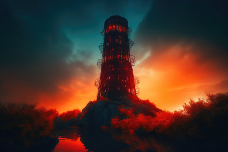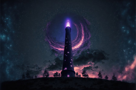 night scenery of the big lighthouse in futuristic world , digital art style, illustration painting, fantasy concept of a big lighthouse