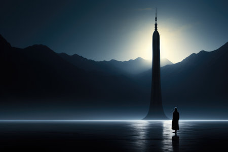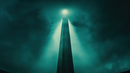 This striking image captures a towering monolith emerging from dark clouds, radiating an ethereal beam of light above, creating a mystical and dramatic atmosphere.