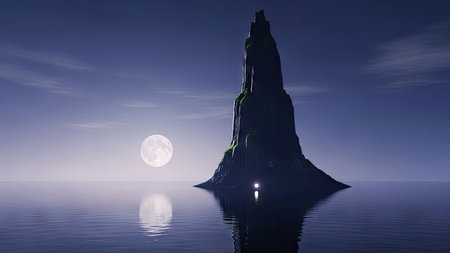 A nighttime scene features a towering island shape illuminated by soft light. The image showcases a full moon reflecting on smooth water, with a cool color palette. This digital artwork might be suitable for artistic prints, conceptual illustrations, or backgrounds in various commercial projects.