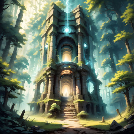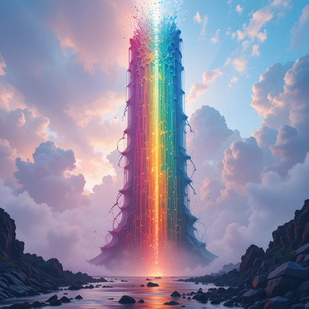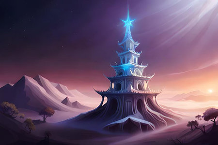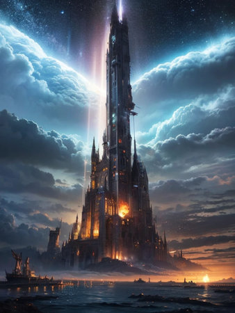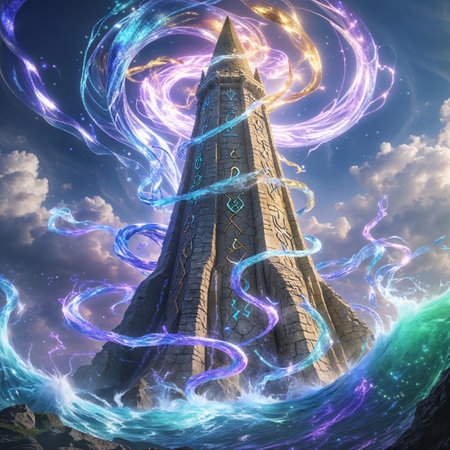 Mystical tower rises amid swirling magical energies at twilight with vibrant colors and dynamic movement