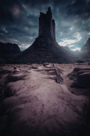 A vast and expansive desert landscape featuring a towering rock formation under a dramatic sky. The image captures the rugged terrain and the serene, isolated beauty of the environment.