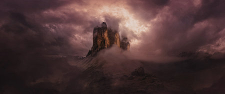 A dramatic and mystical mountain peak rises through a dense, stormy sky during twilight. The scene is filled with dark, ominous clouds and a sense of adventure and mystery.