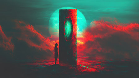A lone figure stands before a mysterious monolith under a sky of an unusual color and strange clouds.