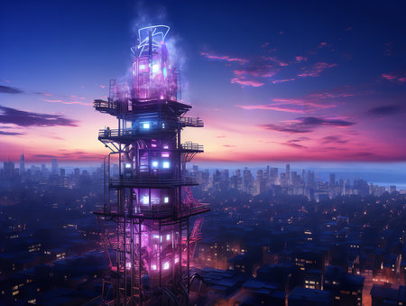 An artistic capture of a telecommunications tower bathed in colorful lights against a soft evening sky, creating a captivating blend of technology and ambiance.