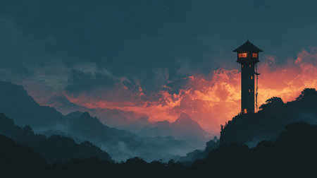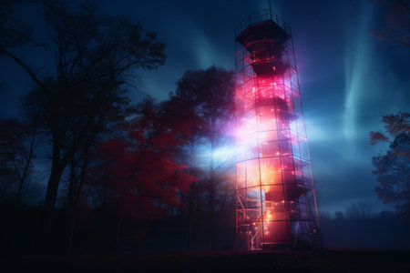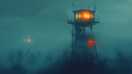 A signal tower surrounded by mist, with lights piercing through the fog.