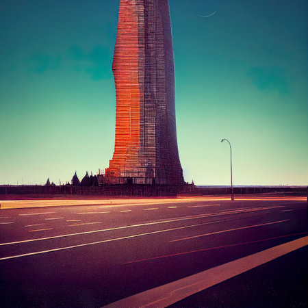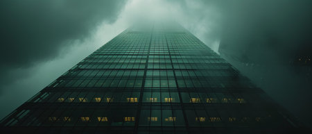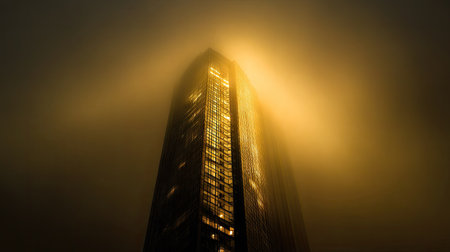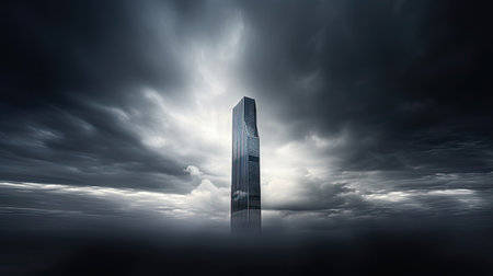An imposing skyscraper pierces through dense atmospheric conditions. The vertical structure's surfaces reflect warm light, contrasting with the encompassing darkness. The image showcases a high-angle composition with dynamic lighting, hinting at a metropolitan environment. Suitable for commercial applications such as architectural visualization and illustrative purposes.