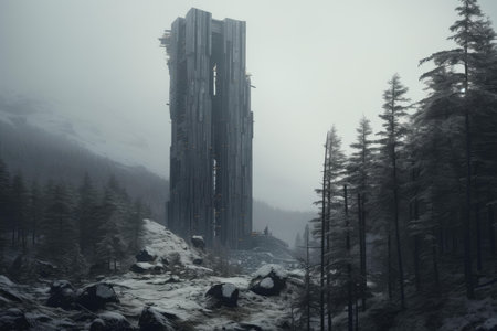 A tall concrete structure stands in the fog, creating a mysterious and dramatic atmosphere.