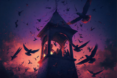 Group ringing bell on tower with birds flying at dusk. Fantasy concept, Illustration painting. Generative AI