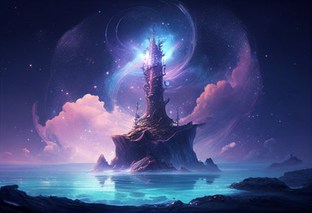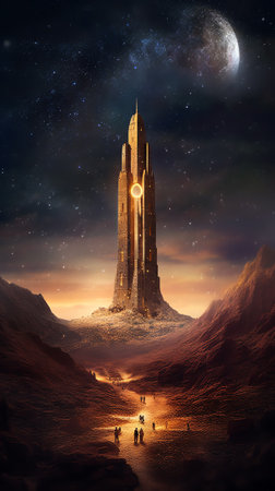 Illuminated tower at night amid rocky landscape and starry sky. That the image is generated using AI.