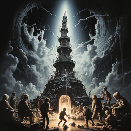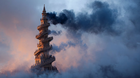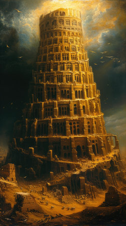 A monumental Tower of Babel pierces the sky, symbolizing human ambition, cultural diversity, unity and discord, human endeavor and divine intervention in this iconic biblical scene.