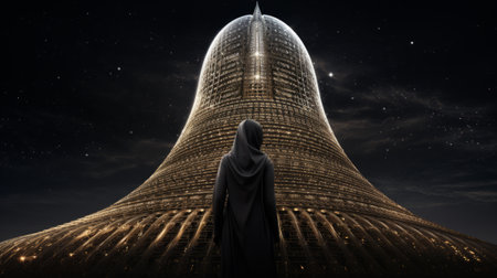 Mysterious man in a black robe standing in front of a futuristic tower at night