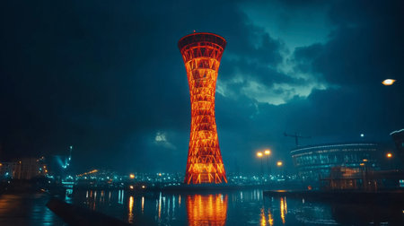 A stunning illuminated tower stands against a dark sky, showcasing vibrant orange light reflecting on the river, creating a mesmerizing urban landscape at night.