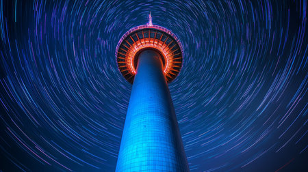 Star Trails Around Illuminated Communication Tower at Night, Long Exposure Photography