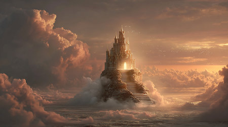 An enchanting tower rises majestically above soft clouds, illuminated by a warm glow. Golden butterflies flutter in a dreamy, mystical atmosphere that invites wonder and exploration.