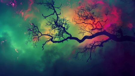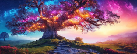 Surreal Night Tree Against Colorful Nebula Background with Cosmic Light