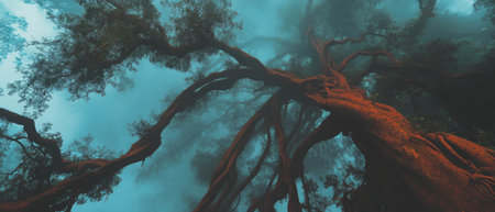 Dark and Mysterious Tree Silhouette in Foggy Forest at Night, Eerie Atmosphere with Ominous Vibes and Striking Shadows Illuminated by Moonlight