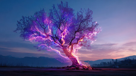 An enchanting tree stands majestically at dusk, illuminated by vibrant purple light, set against a backdrop of serene mountains and a colorful sky.