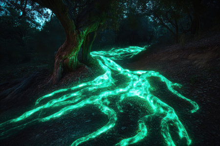 Bioluminescent moss covering ancient tree roots, glowing blue green in twilight