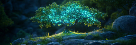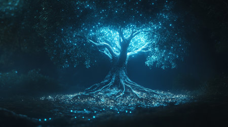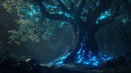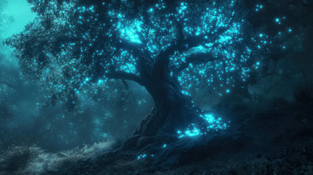 Enchanted tree with glowing blue lights in a dark forest, mystical atmosphere. Fantasy and magic concept