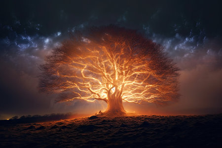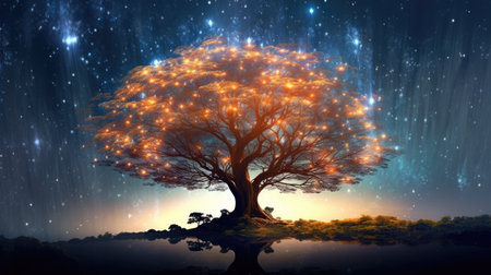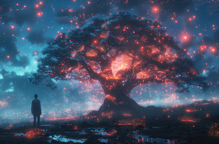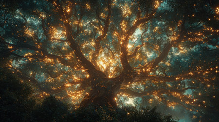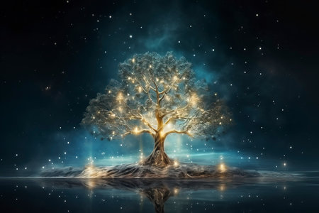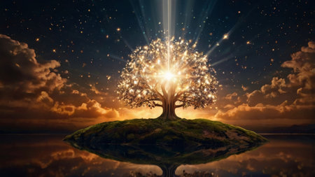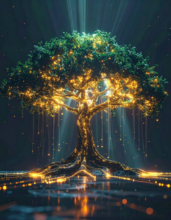 In a realm where ancient wisdom meets the digital frontier, a sacred tree glows with celestial light.