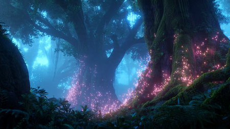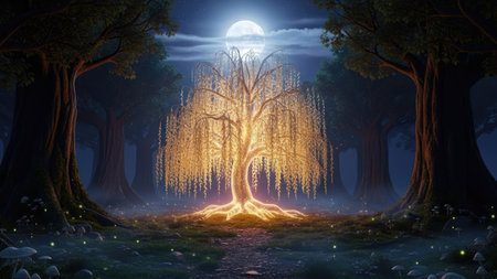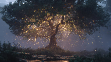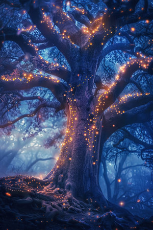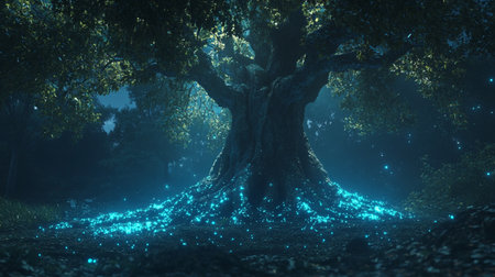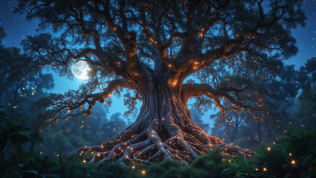 A massive ancient tree glowing with magical lights under the moonlight in a mystical forest. Twisting roots, thick branches, and sparkling orbs create a fairytale atmosphere. Ideal for fantasy themes, storytelling, mystical nature, and enchanted worlds.