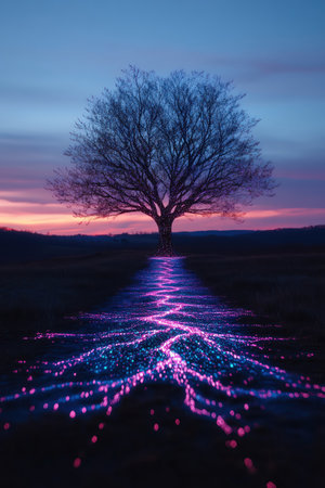 Holographic tree of life, digital roots, twilight, wide shot, synergy of nature and tech