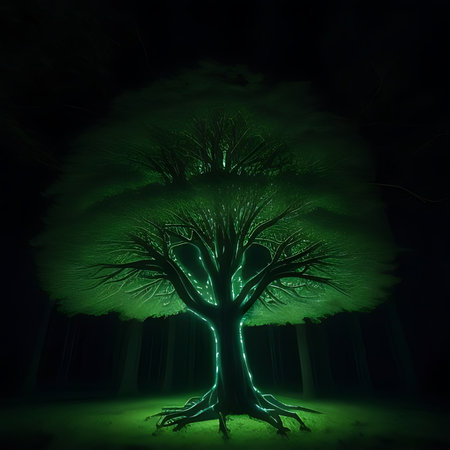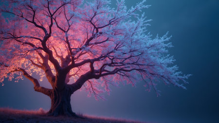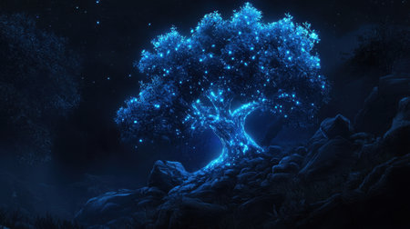 Enchanted tree glowing softly under starlight, each branch illuminated as if touched by magic.