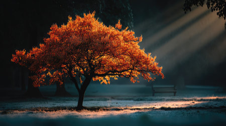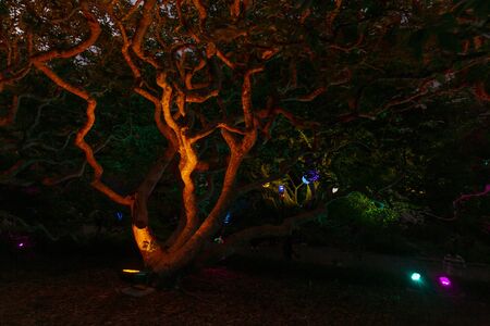A vibrant tree is lit up, casting a soft glow on the ground, creating a tranquil nighttime ambiance for viewers.